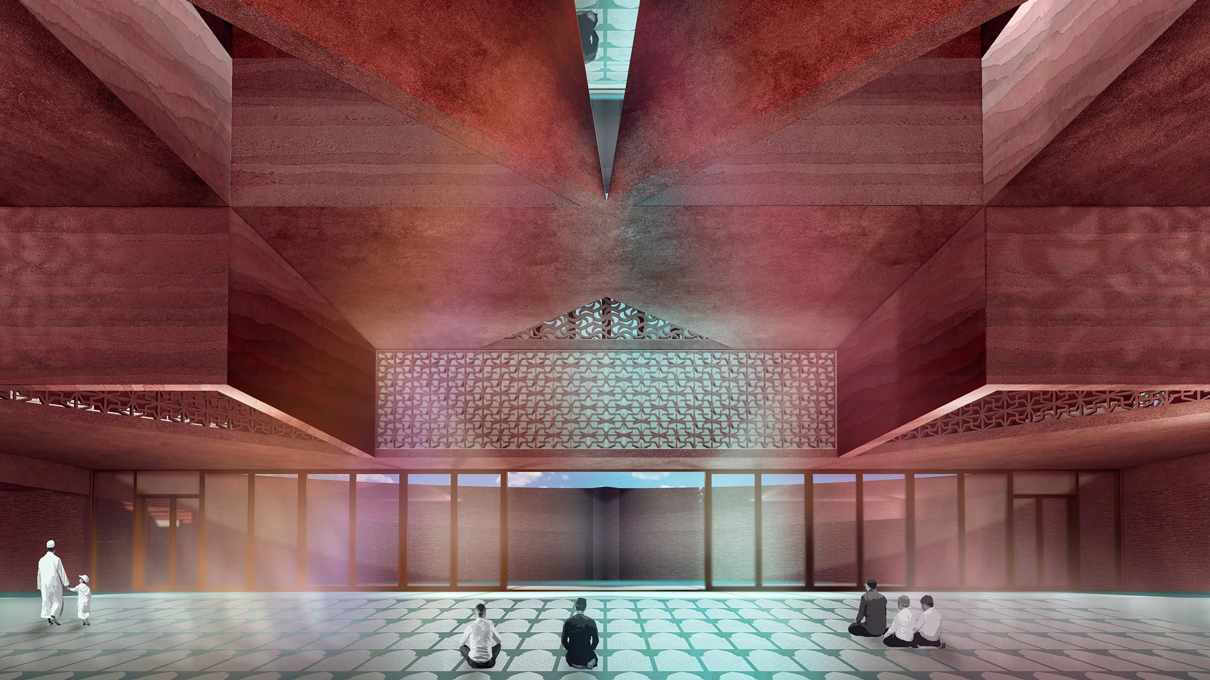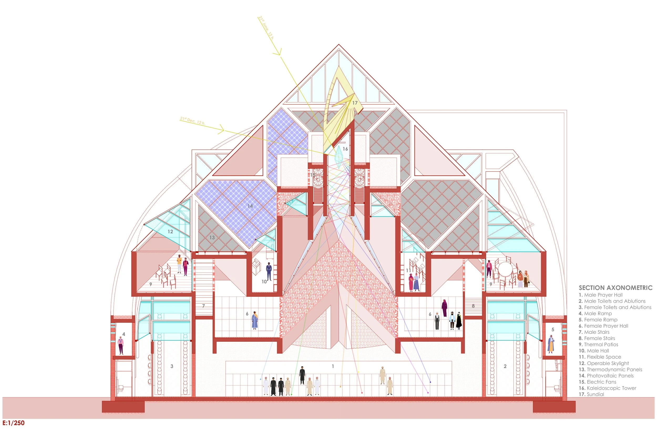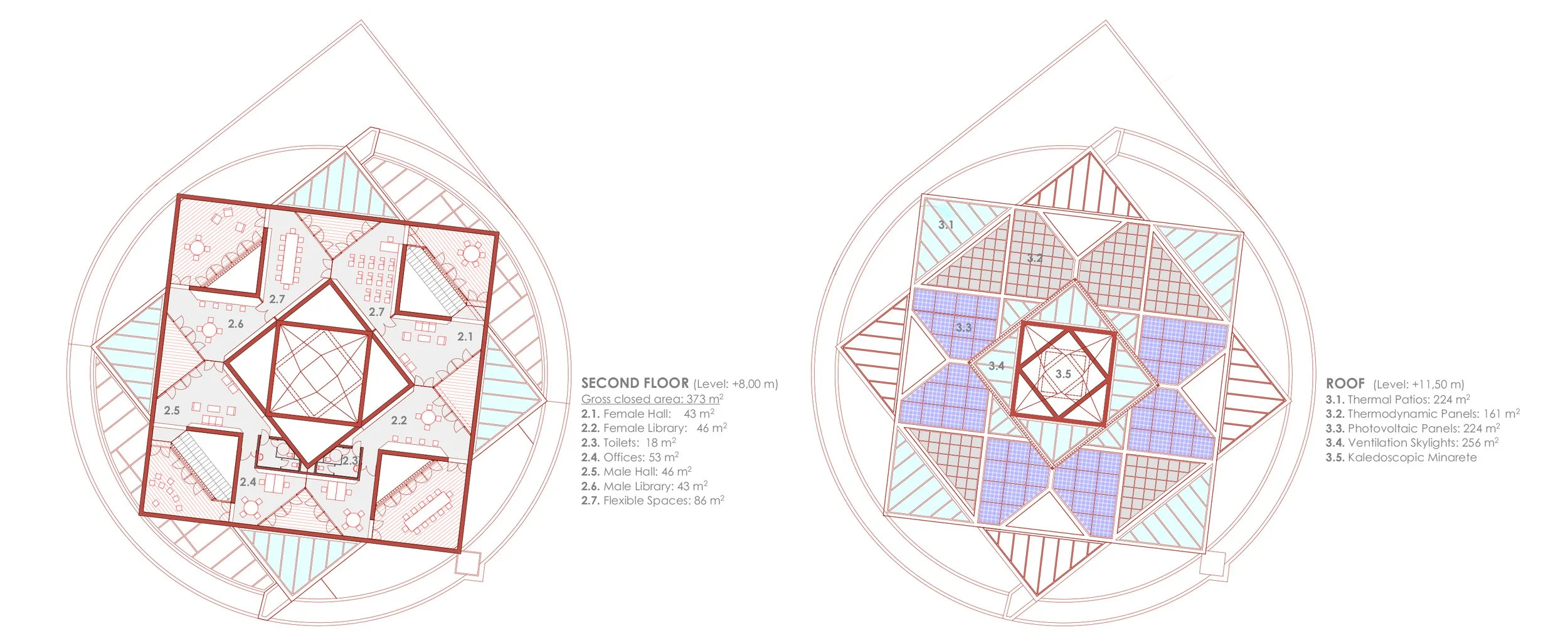 The main space of the building contains the prayer halls. On the ground floor is the men’s hall and on the first floor the women’s hall, separated by a lattice that allows sound and air to go through, filtering visibility. Both spaces face a curved qibla wall with a pond, which reflects the sky as the only connection with the exterior. This space is surrounded by the walls of the rotated geometries, creating entrances for light and air and providing a unique ambience through the natural light filtered by the lattices. A kaleidoscopic minaret completes the space, marking the prayer times led by the solar cycle. A few gaps allow the sun to travel through, where a glass prism diffracts the light, dropping through a set of reflecting surfaces and flooding the space with multicoloured dots, pointing to the magical moment of prayer.