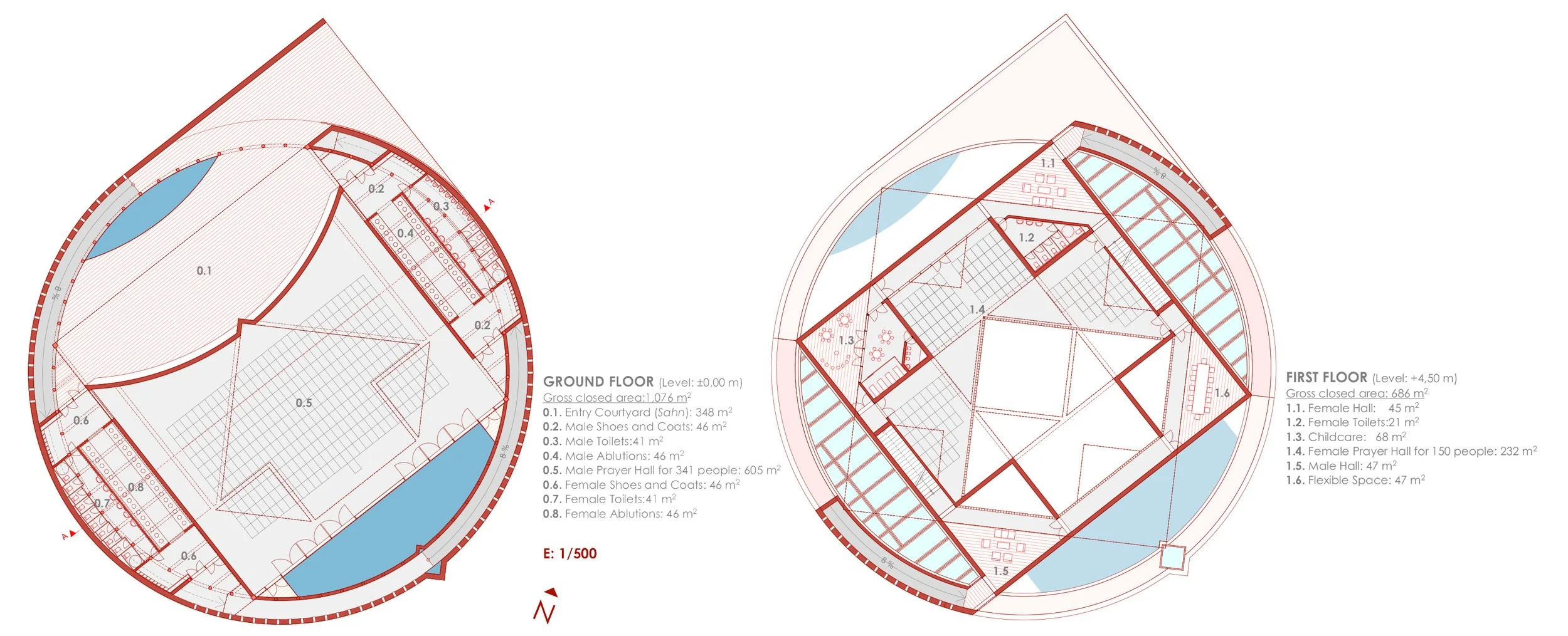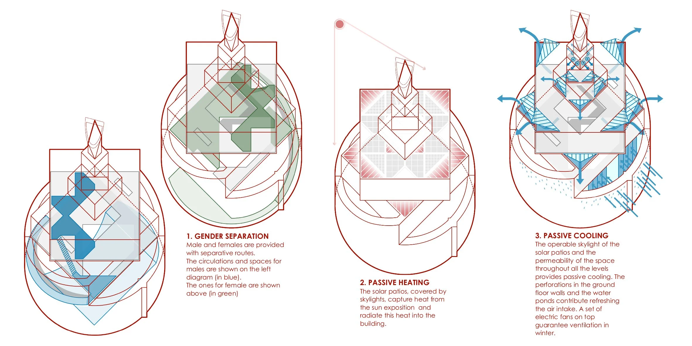 The proposed design takes these ideas as its design principles. The circular ground floor provides an introspective form, inscribing the rotation of the squared upper floors. With this mechanism, the building creates many patios and openings that illuminate and ventilate spaces on different levels, reaching the main prayer hall on the ground floor. The upper floors constitute an inhabited dome covering the central space of the mosque and providing a feeling of togetherness.