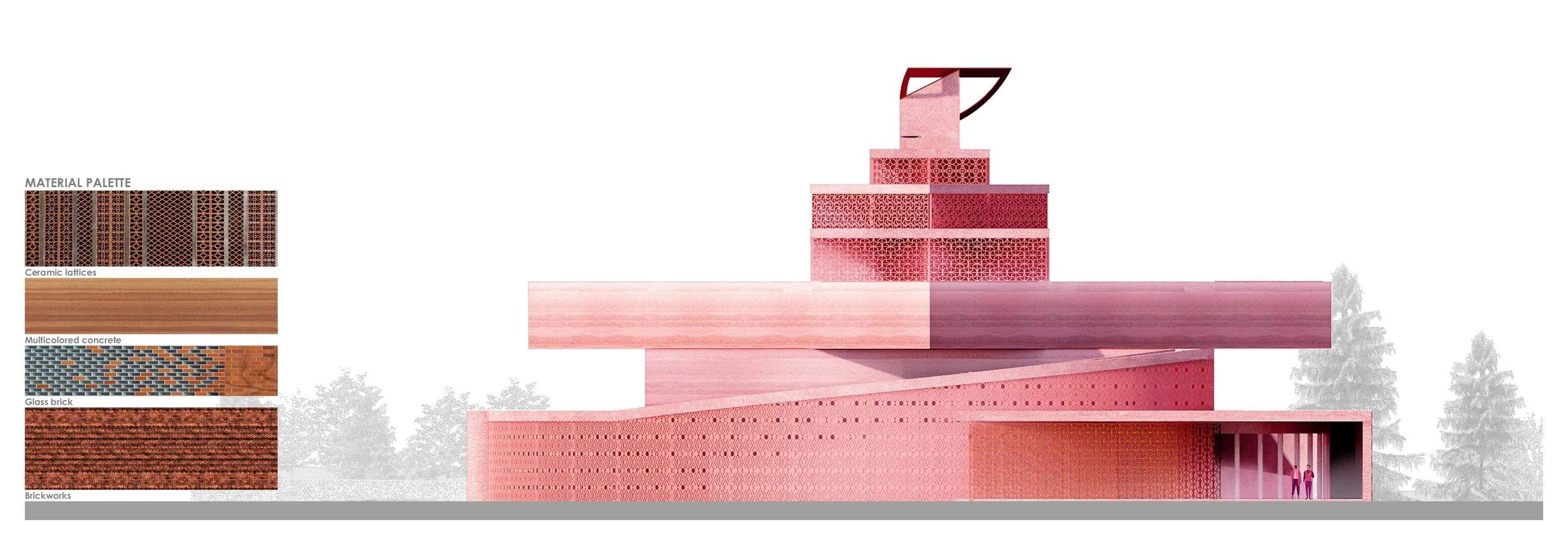 The presence of the building is based on the geometric simplicity of the different floors and their rotations. This layout generates a changing perception of the building related to how each volume casts shadows on the others, which can be appreciated by an observer driving along the highway. Elaborate brick masonry is used to build the circular perimeter, connecting with a long Muslim tradition of decorated brick patterns. The brickwork allows for the inclusion of glass bricks, following its particular tectonics, creating dotted lights along ramps and circulations. The walls of the upper floors act as structural beams, leaning one on top of the other and allowing us to support the whole building in just four corners. The texture of the reinforced concrete beams is treated as a rammed earth wall through a multicoloured layer created with a diverse mix of sand, leaving a trail from the tectonic process and evoking diversity and integration.