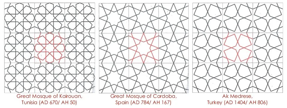 The sophistication of geometric patterns has become characteristic of Islamic architecture throughout history. The repetition, rotation and overlapping of geometries deploy designs commanded by diagonals in the generation of star-like shapes and endless lines criss-crossing the surfaces. These patterns often represent the signatural identity of each mosque.