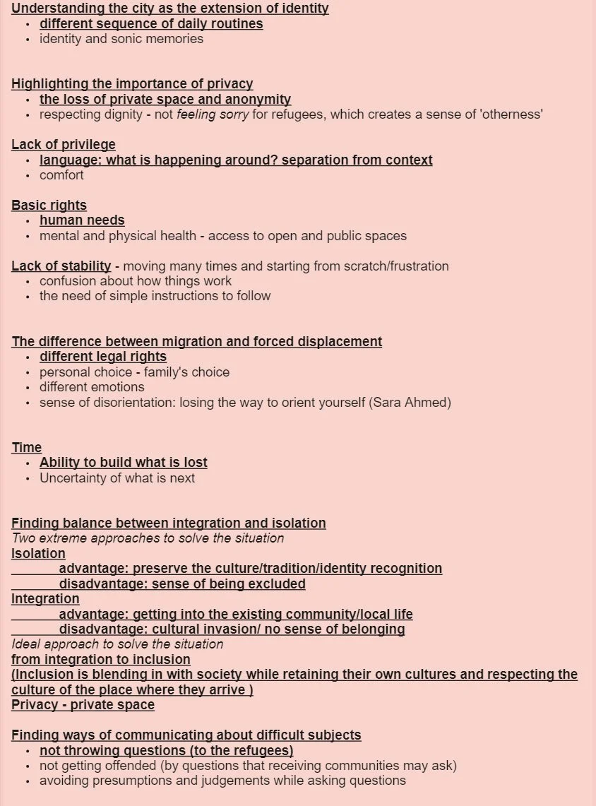 We will introduce the multidisciplinary dimension of the problem: we will have introductory talks by sociologists, politicians, anthropologists, psychologists, urban thinkers and architects. This will facilitate a complex understanding of the overall refugee/displacement crisis and move us away from naive, simplistic design ventures.